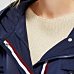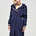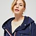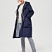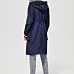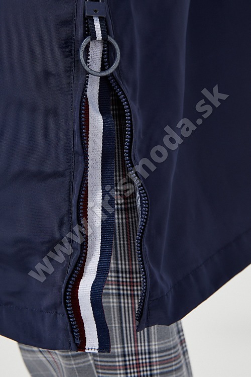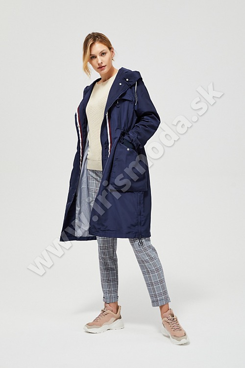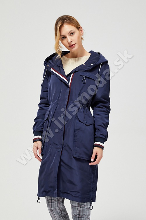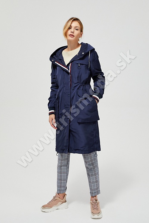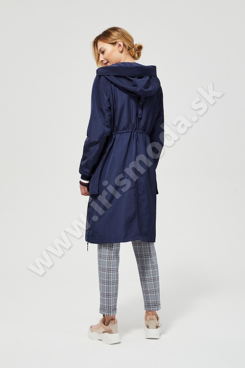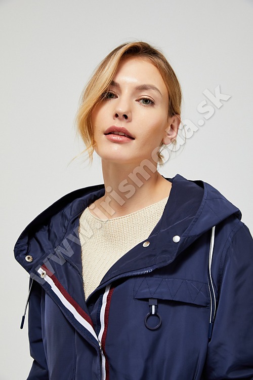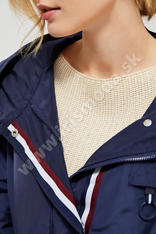 Námornícka modrá bunda so širokou kapucňou. V páse lem, ktorý nastavuje šírku a zvýrazňuje pás. Dve veľké vrecká vpredu, zapínanie na patentku. Tretie vrecko na zips s ozdobnou karabínou je umiestnené v úrovni ľavej časti hrudníka. Dlhé rukávy s farebným rebrovaním. Bunda je celá na zips, pozdĺž ktorej je stuha v bielych, gaštanových a tmavomodrých pruhoch. V dolnej časti, po stranách, pôvabné vzpery, ktorých veľkosť si užívateľ môže upraviť pomocou zipsu. Dĺžka nad kolená. Podšitá bunda bude ako stvorená pre teplejšie jesenne a jarné dni