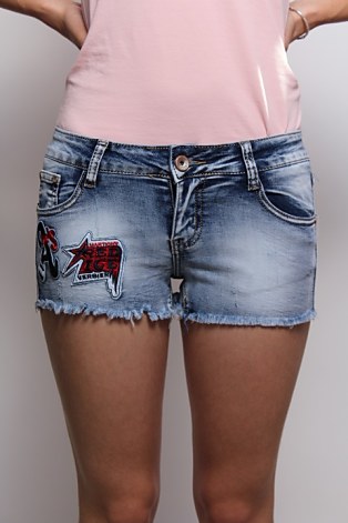 Dámske krátke, rifľové nohavice s nášivkami. Nášivky sú na pravej strane. Nohavice sú na konci roztrapkané a sú elastické.