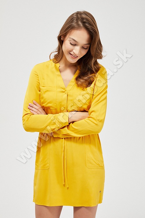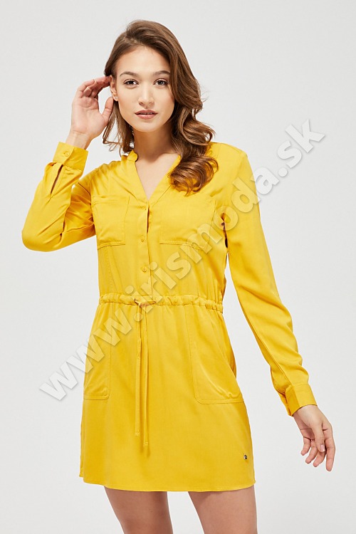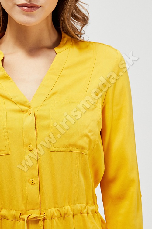 Letné šaty jednoduchého strihu. Vpredu štyri vrecká; dva vo výške hrudníka, dva vo výške bokov. Výstrih do V s 3 gombíkmi. V páse je všitá šnúrka. Dlhé rukávy sú zakončené manžetou. Dĺžka šiat je do polovice stehien. Žltá farba.