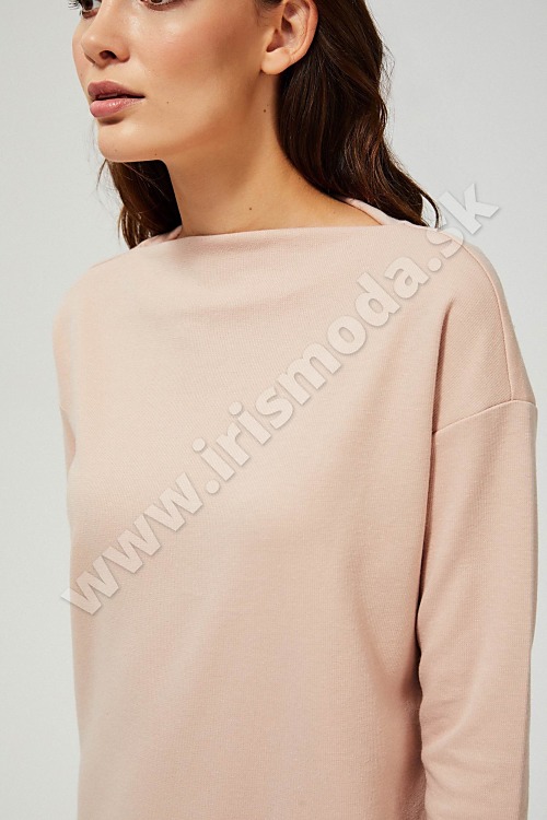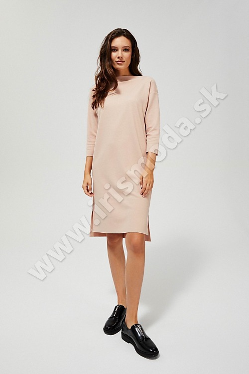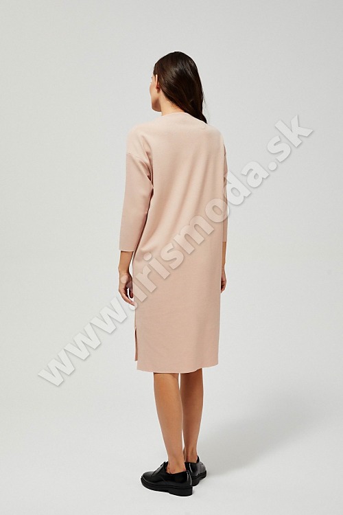 Jednoduché, univerzálne šaty z hrejivého úpletu. Krásna, jemna ruzovkasta farba s hladkým vzorom. 3/4 rukáv so zníženou líniou ramien. Na spodných okrajoch sú jemné bočné rozparky. Dĺžka šiat je pod kolená, chrbát o niečo dlhší. Sú dokonale pre dennodenne nosenie do prace v kombinácii s originálnym doplnkami.