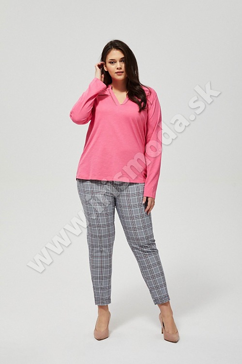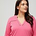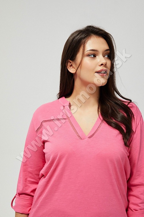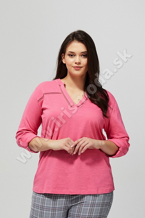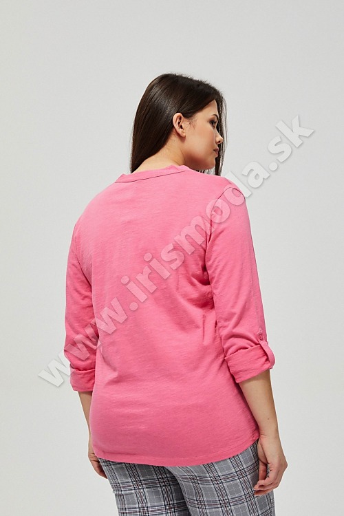Bavlnené tričko klasického strihu. Výstrih Henley s prelamovaným zdobením. Rukáv 3/4 dĺžky. Ružová farba.