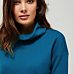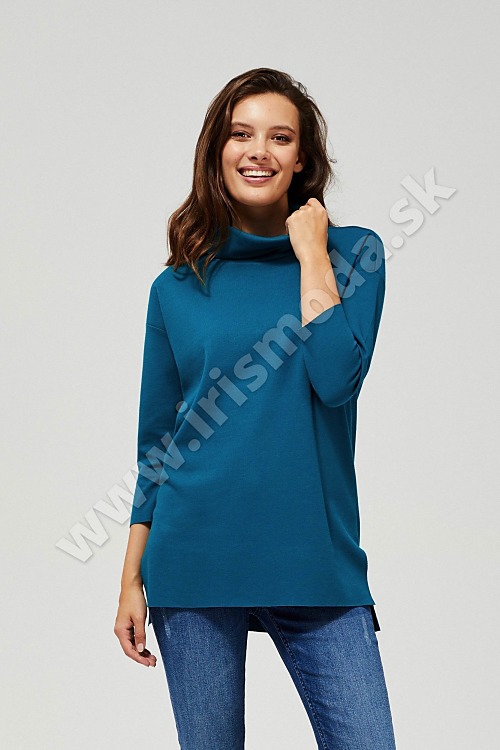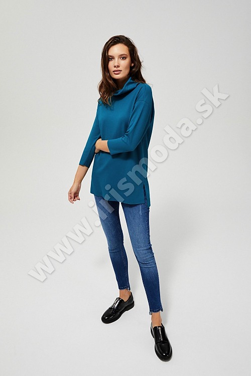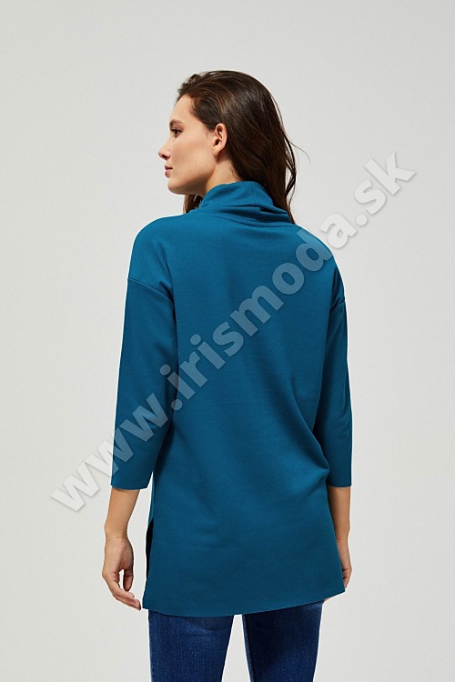 Vynikajúca dlhá roláková mikina v intenzívnej tyrkysovej farbe. Hladký vzor. Obliekanie je cez hlavu. Široké 3/4 rukávy so zníženou líniou ramien. Voľný strih pohodlne prilieha k telu a umožňuje neobmedzený pohyb.