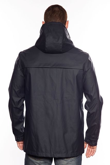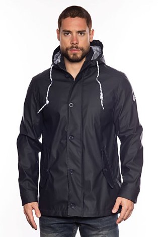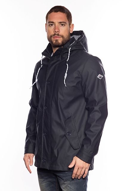 Pánska prechodná bunda s kapucňou s nášivkou na ľavom ramene. Bunda má dvojité zapínanie, na zips a gombíky .