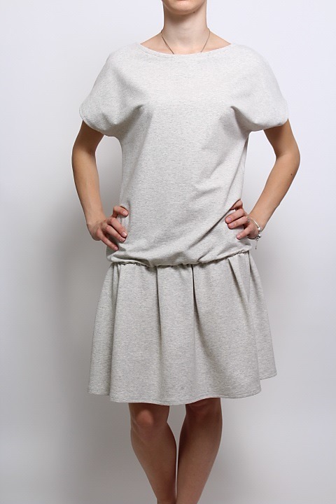 Hladké šaty s krátkym rukávom, pod bruchom stiahnuté gumičkou .