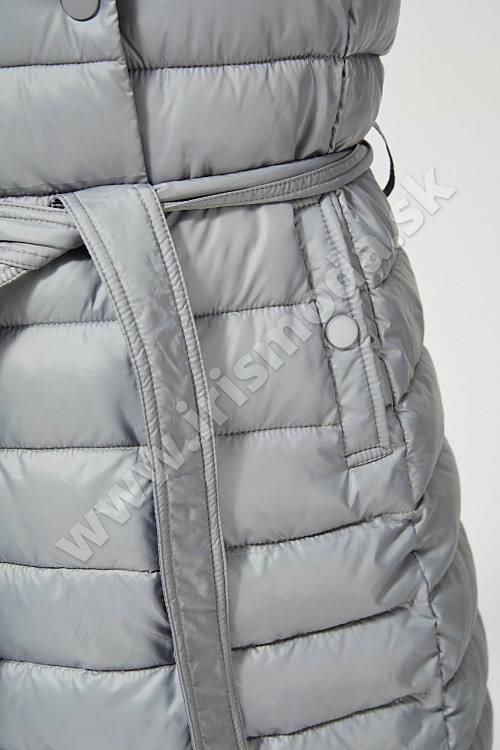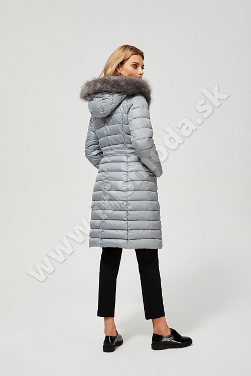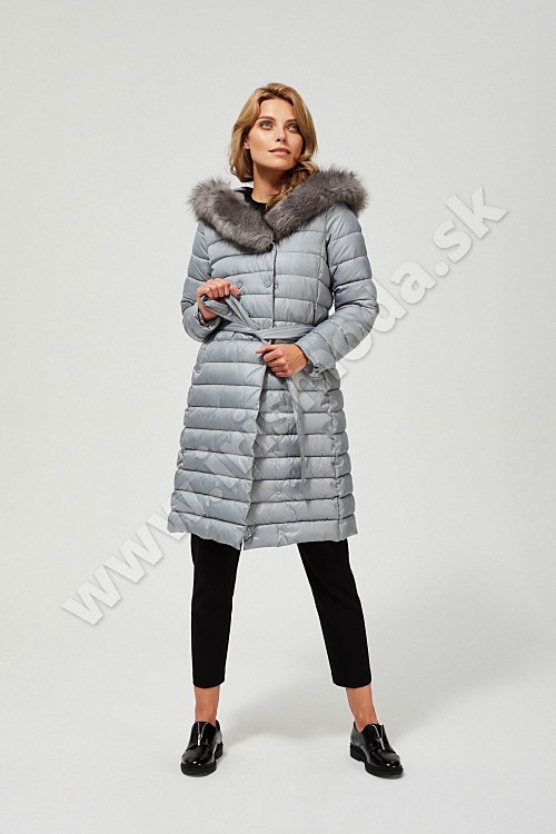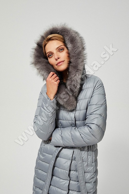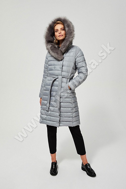 Štýlový sivý kabát s kapucňou a umelou kožušinou. Hladký vzor. Možnosť úpravy strihu vďaka viazaniu v páse. Zapínanie je dvojradové na patentky. Prešívaná, s izoláciou a podšívkou vo vnútri. Dĺžka nad kolená. Po stranách dve vrecká so zapínaním na cvočky. Elegantné a praktické. Poskytne pohodlie v chladnom počasí.